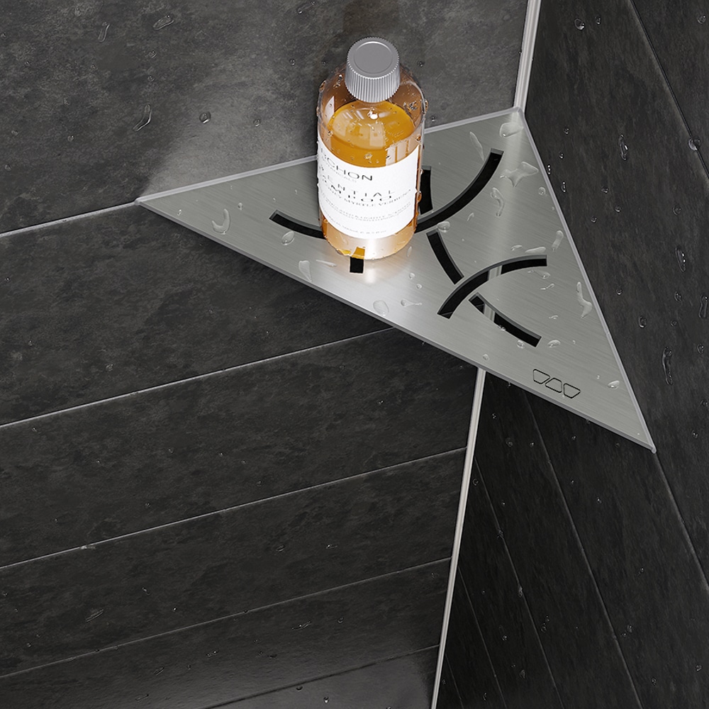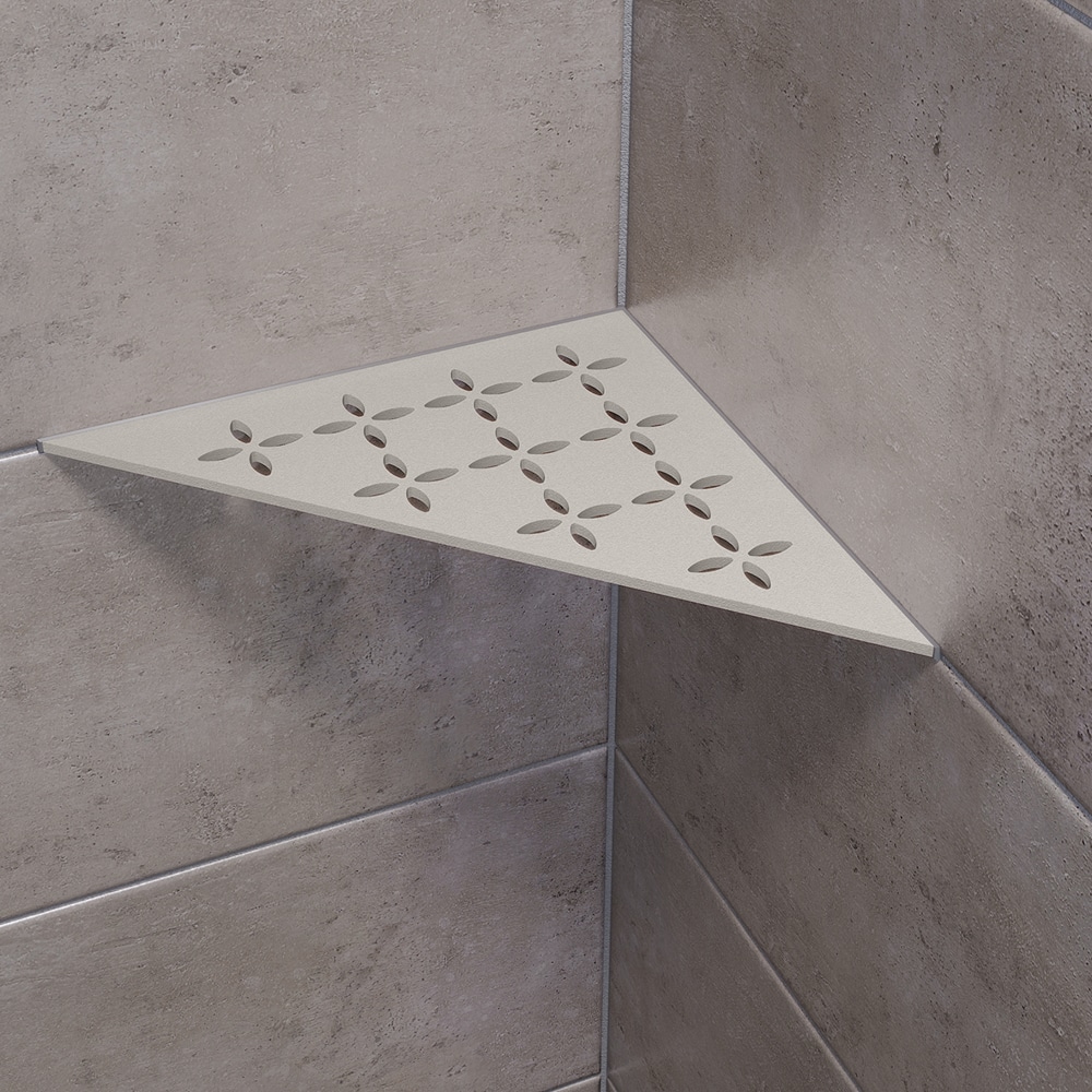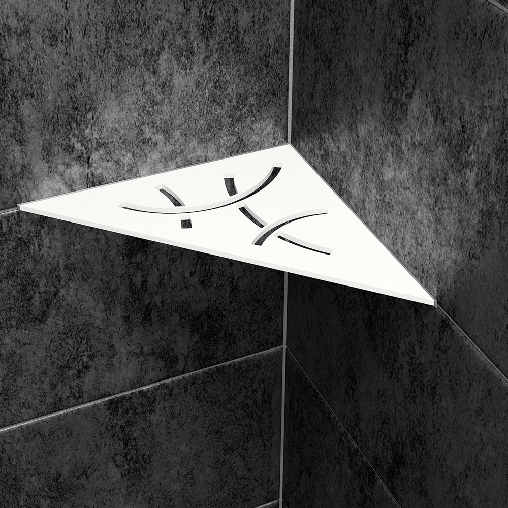 Schlüter-SHELF-E-S1 är en smart förvaringslösning med triangulära hyllplan som är speciellt utformade för montering i hörn. Den finns i olika designvarianter som FLORAL, CURVE, PURE, SQUARE och WAVE, så att du kan matcha hyllan perfekt till din inredning. Du kan välja mellan borstat rostfritt stål eller aluminium med TRENDLINE pulverlack för en snygg och hållbar finish.